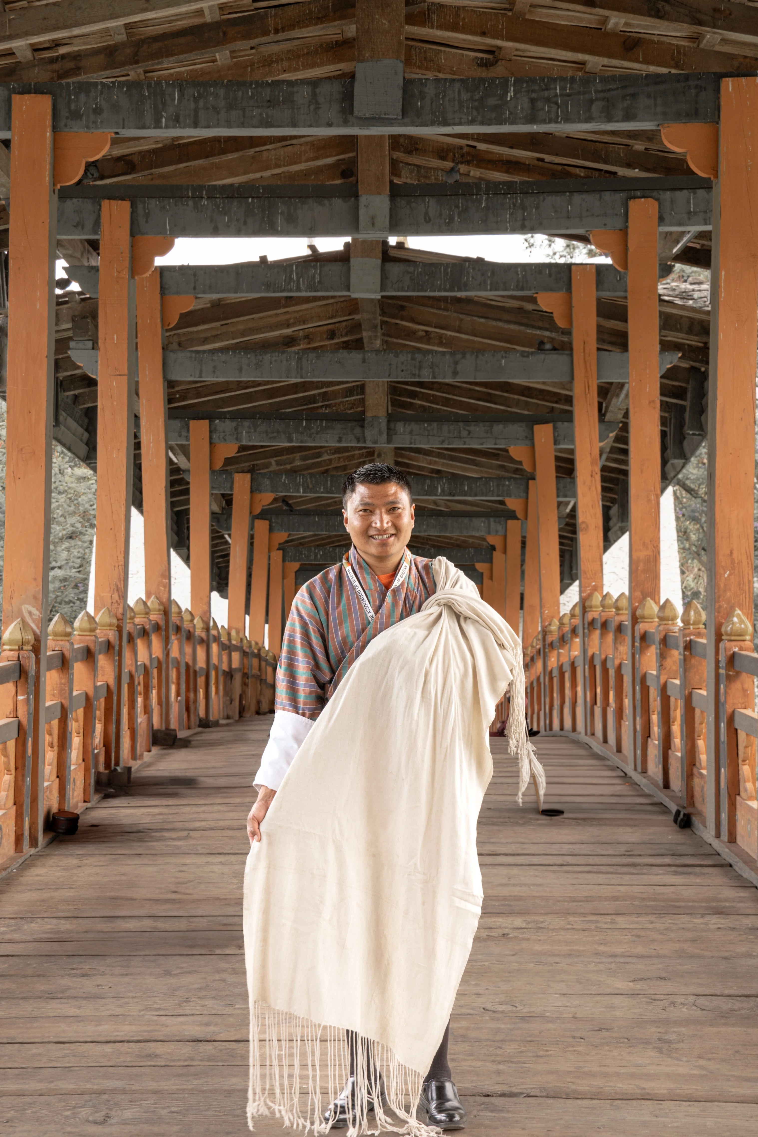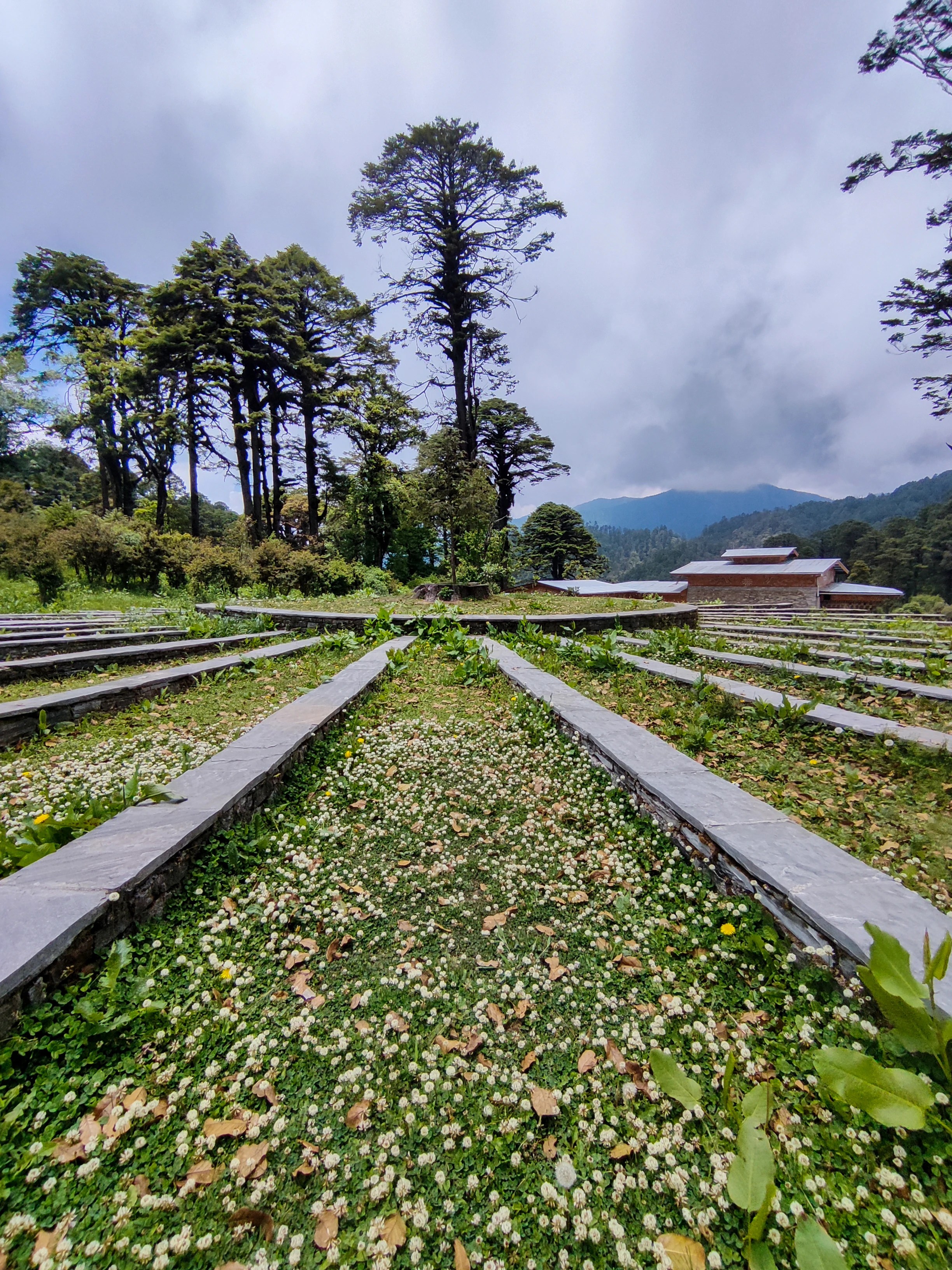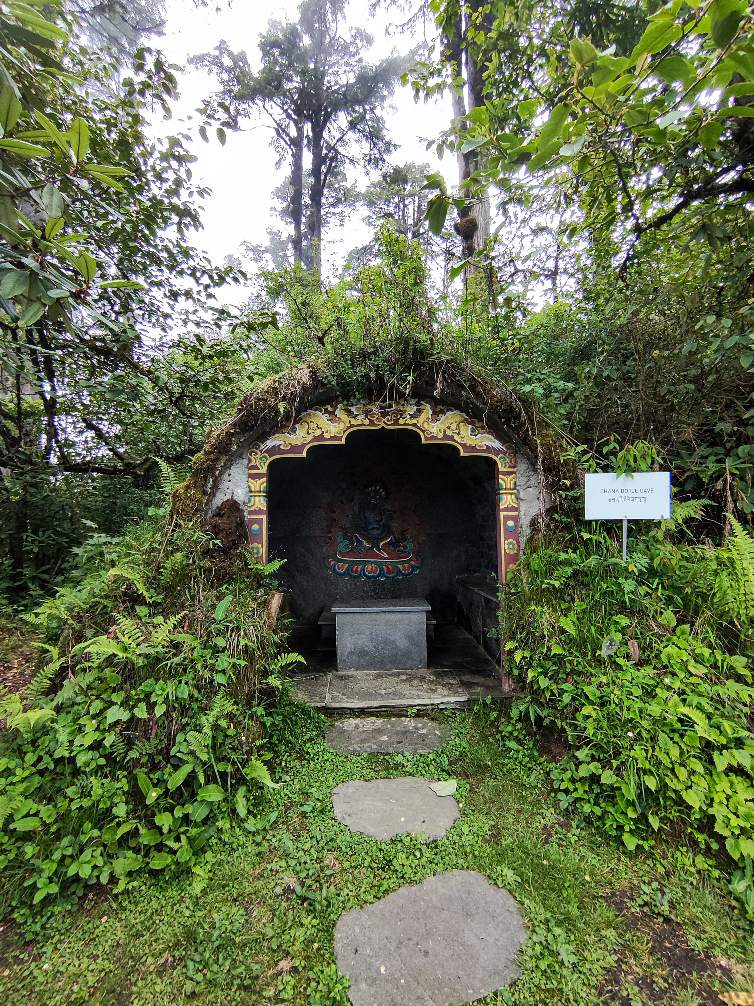 Our first stop for the day was Dochula pass which is at 10000+ft above sea level. The clouds keep covering the pass making it look dreamy! The specialty of this place is the 108 Chortens built by the current eldest Queen mother to honor the sacrifice of the soldiers who fought the war against the Assamese insurgents who had occupied the area in 2003. The Druk Wangyal Chortens were inaugurated in 2004. We explored the chortens taking photographs and filming videos for reels. There is also a monastery built on the opposite feature but the entry for tourists is restricted. There is also an anniversary park built to celebrate the 60th birthday of His Majesty Druk Gyalpo Jigme Singye Wangchuck. The park consists of multiple view points of the chorten complex, Café, ring of Reign and 11 meditation caves. The significance of each construction at this park holds significance. The 16 stairs at the entrance signify the age at which the H.M the Fourth Druk Gyalpo ascended to the throne. The 34 spokes in the ring of reign signify the total years of reign and the number of caves, 11 is the birth date of the king. The Anniversary Park is very quiet and serene. One can spend good silent time here. It is very rare to find such a peaceful place at a famous tourist spot. There is a also a café where one can sip hot beverages and have snacks. The traditional clothes of Bhutan Gho and Kira are available for rent for the tourists.